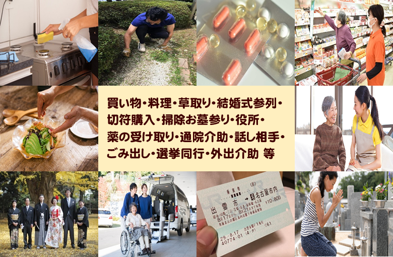 サービス内容 買い物・料理・草取り・ゴミ出し・銀行・役所の手続き・通院介助・薬の受け渡し・話し相手・結婚式参列・選挙同行・同窓会・食事会・お墓掃除・お見舞い・電球交換・旅行 等